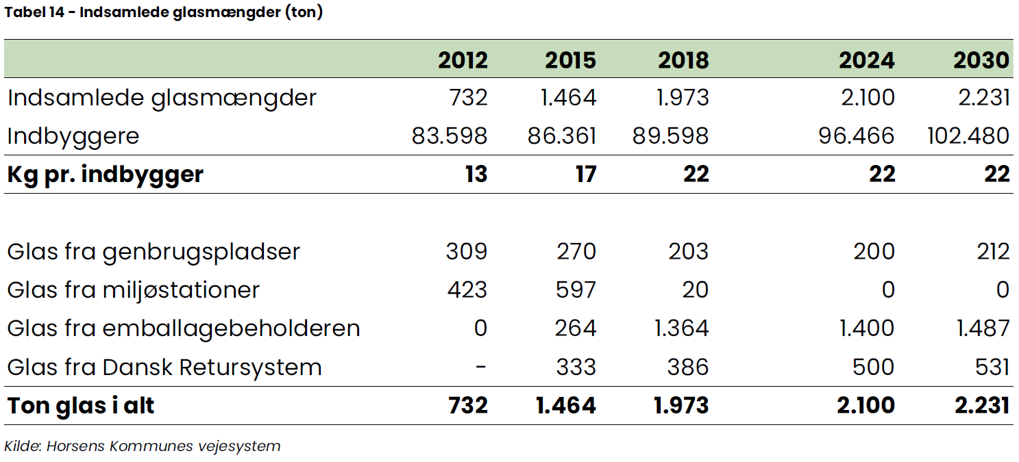 Tabel 14 viser hvordan mængden af glasaffald er steget 35% i perioden fra 2015-2018, hvor indsamlingsordningen er indført.