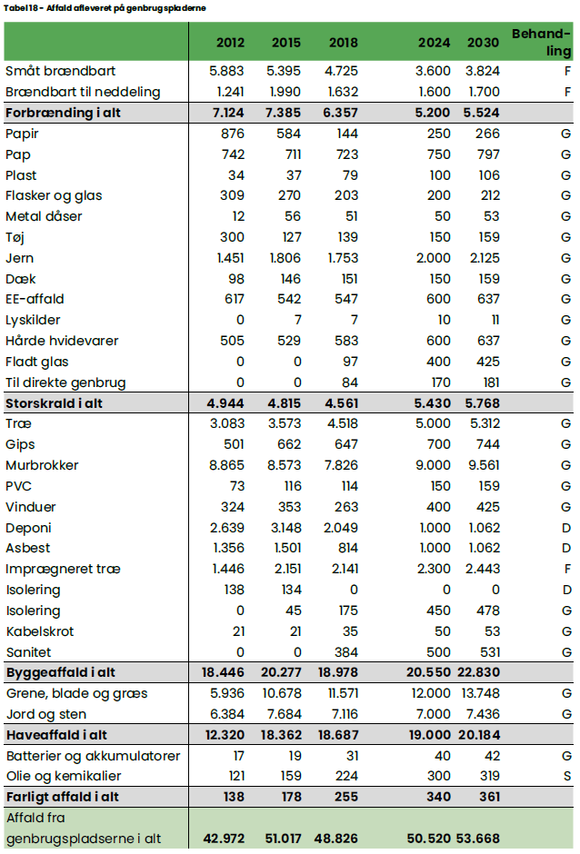 På alle genbrugspladserne sorteres der i følgende 37 fraktioner; akkumulatorer, asbest-holddige eternitplader, belysningsudstyr, bøger, deponi, dæk, fjernsyn og skærme, gips, glasemballage, glas-fladt, haveaffald, hvidevarer, imprægneret træ, isolering, jern og metal, jord, kabelskrot, kemikalieaffald, klare dunke, kølemøbler, murbrokker, olieholdige maskiner, pap, papir, PE-plastfolie, PET flasker, PVC til genbrug, rent træ, sanitet, små batterier, små husholdningsapparater, småt brændbart, stofmøbler, trykflasker, trærødder, tøj og vinduer.
