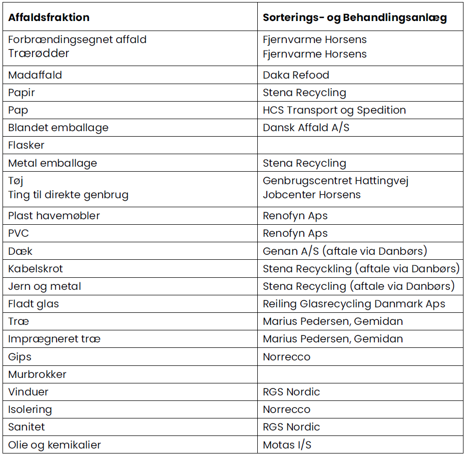 Ud over egne sorterings- og behandlingsanlæg benytter Horsens Kommune sig af følgende andre sorterings og -behandlingsanlæg.