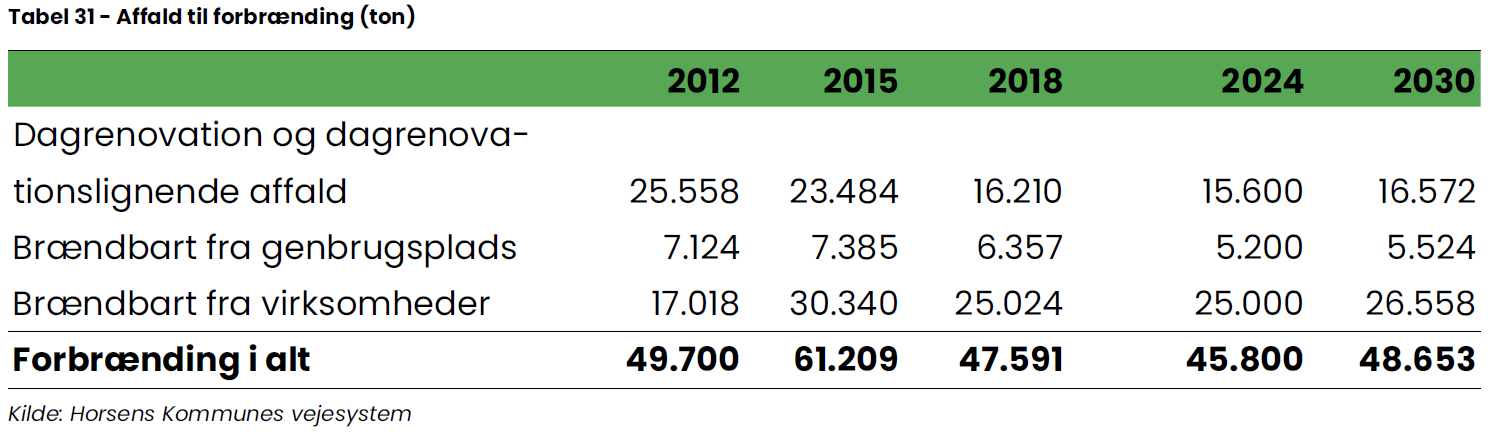 Nedenstående prognose er en fremskrivning af affaldsmængderne til forbrænding på baggrund af den forventede udvikling i antallet af indbyggere i Horsens Kommune og en generel udvikling i mængden af affald pr. indbygger. Den forventede effekt af øget sortering af husholdningsaffaldet er indregnet.