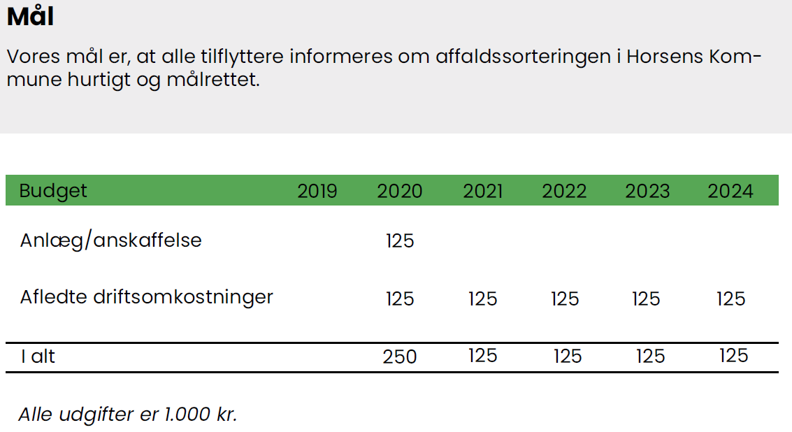 Vi annoncerer allerede om affaldssortering i flytteguiden for Horsens Kommune. Men bevidstheden om affaldssortering hos tilflyttere og unge, som flytter hjemmefra, skal styrkes. Ved at informere straks efter flytning øger vi chancen for, at folk får grundlagt gode vaner, som de beholder.