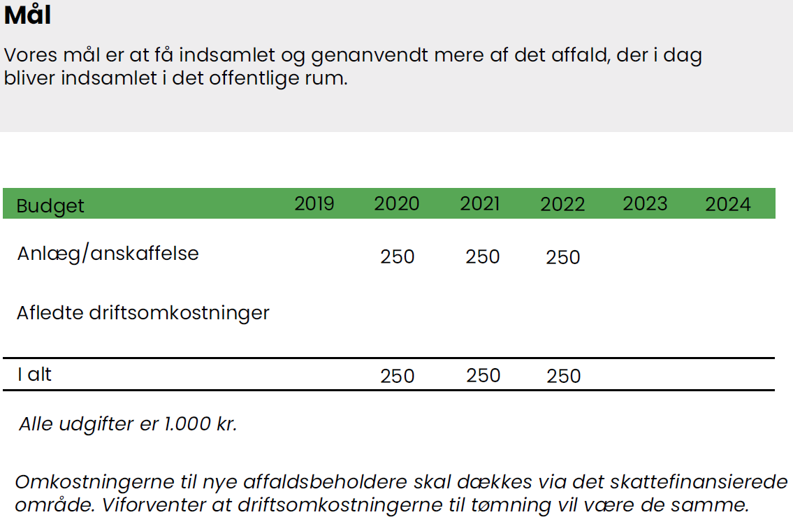 Med vores gode erfaringer vil vi derfor fortsætte med at etablere affaldssortering i det offentlige rum ved at udskifte udvalgte skraldespande. På den måde vil borgerne møde affaldssortering, når de er derhjemme, børn i institutionerne, voksne på arbejde på kommunale institutioner, ved arrangementer og i det offentlige rum.