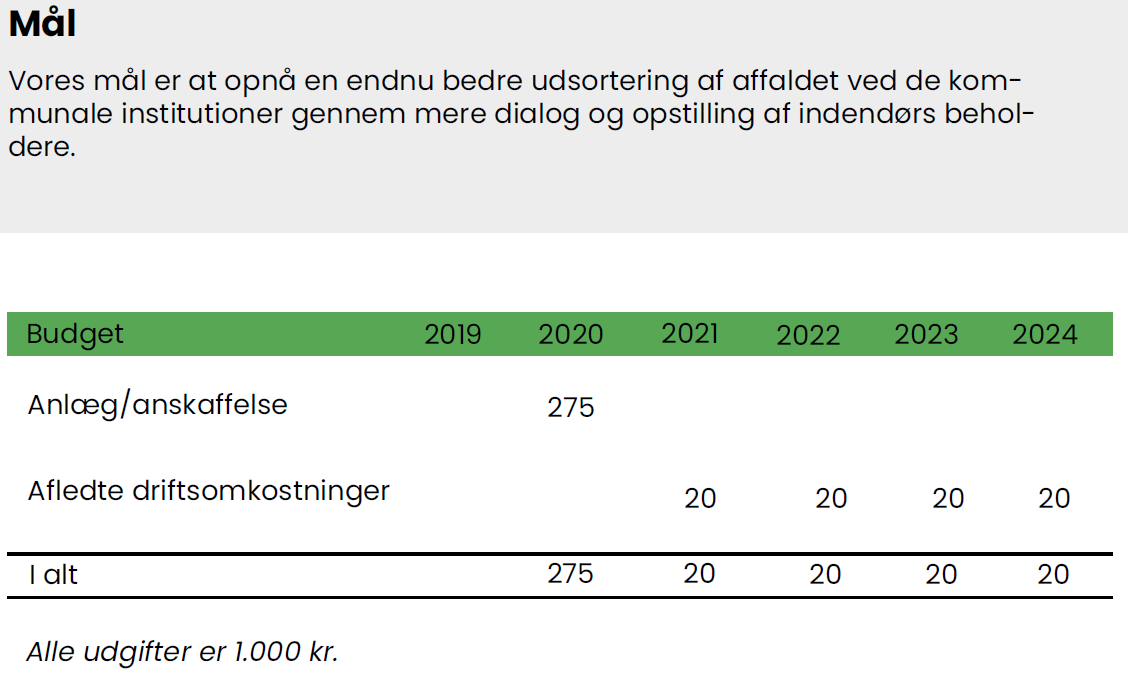 Ved implementeringen på skolerne og daginstitutionerne stillede vi de indendørs beholdere til rådighed, hvilket resulterede i en god affaldssortering.