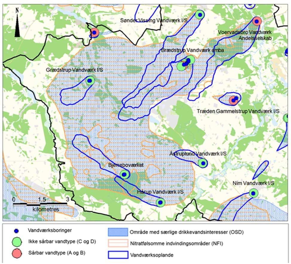 Figur 18: Brædstrup OSD med NFI, vandværksoplande og vandtyper.