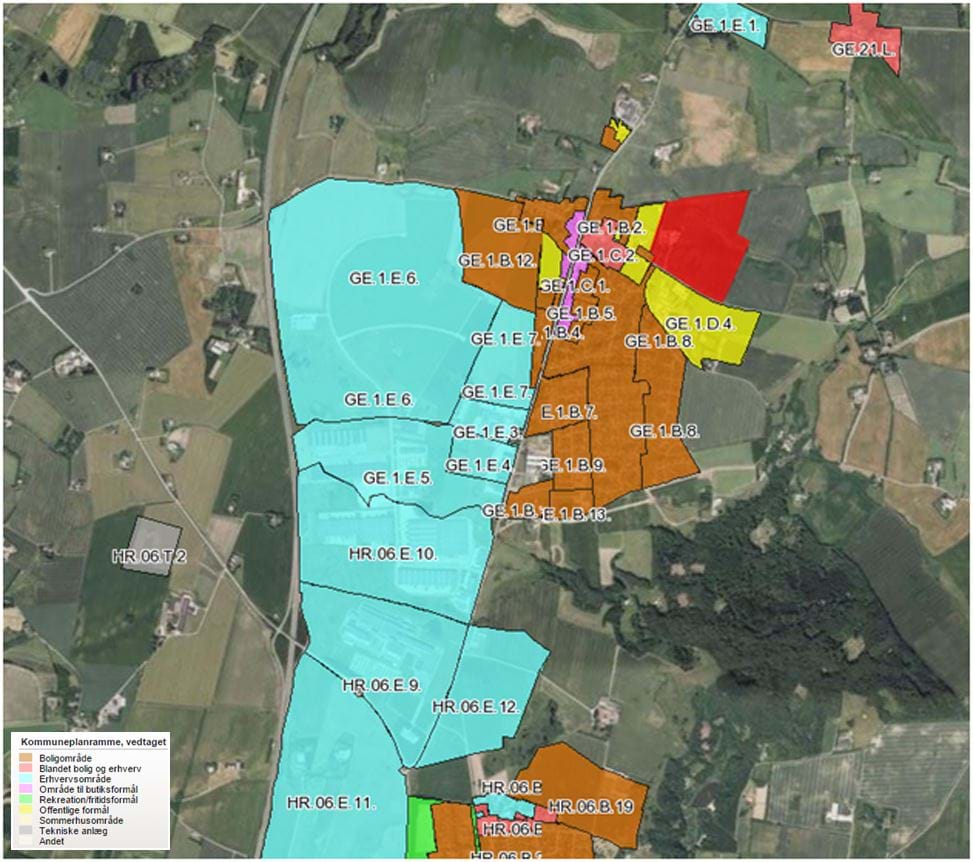 Figur 13: Det nye byvækstareal (med rødt) i Gedved forhold til de gældende kommuneplanrammer.