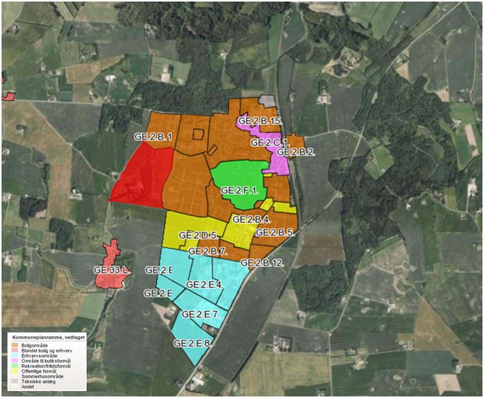 Figur 12: Det nye byvækstareal i Hovedgård (med rødt) i forhold til de gældende kommuneplanrammer.