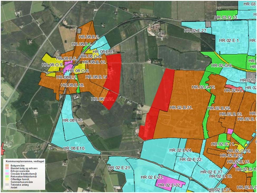 Figur 9: De nye byvækstarealer i Hatting og Østerhåb (Torsted) (med rødt) i forhold til de gældende kommuneplanrammer.