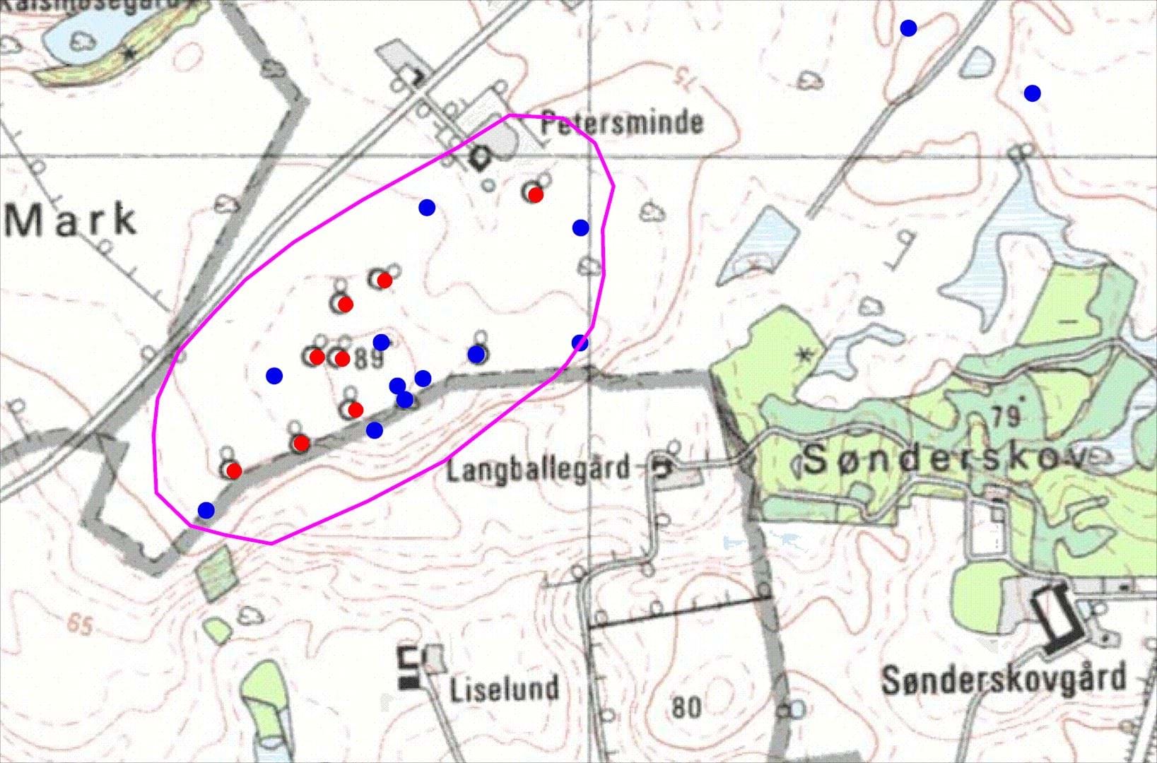 Rødt fredede gravhøje og blåt skjulte fortidsminder (overpløjede gravhøje)
