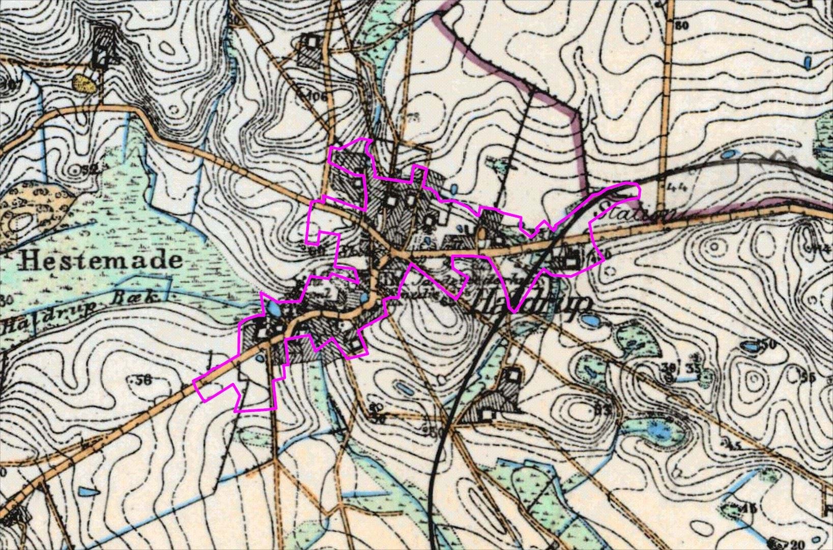 Haldrup ligger en kilometer indenlands på den nordlige side af Horsens Fjord. I 1688 var det en stor landsby med 20 gårde og 4 huse beliggende omkring en lang slynget bygade med en trekantet fortelignende bymidte. Efter udskiftningen i 1782 blev nogle gårde udflyttet, men landsbyen bevarede sit sluttede præg og som hovedby i Vær sogn var det her, at udviklingen var størst. I 1874 husede byen også smedje, jordemoderhus og skole. Ved byens vestlige entre ligger resterne af en vandmølle som i midten af 1800-tallet blev suppleret med en vindmølle på bakken, begge er nedlagt. Forsamlingshuset kom til i 1887, nybygget 1934. Haldrup station på Horsens-Odderbanen blev anlagt 1904 i byens østlige udkant. Linjen blev nedlagt i 1967, men fra Haldrup til Horsens kan man nu cykle på det gamle jernbanetrace. Stationen fungerede også som postkontor og ved siden af åbnede en telefoncentral. Haldrup Brugsforening anlagdes i bymidten 1909 og lukkede omkring 1980. I efterkrigsårene førtes hovedvejen udenom byen. Haldrup har bevaret en charmerende blanding af ældre gårdbyggeri og andelstidens huse, der fortæller om udviklingen af et mindre landsbysamfund de seneste 200 år.
