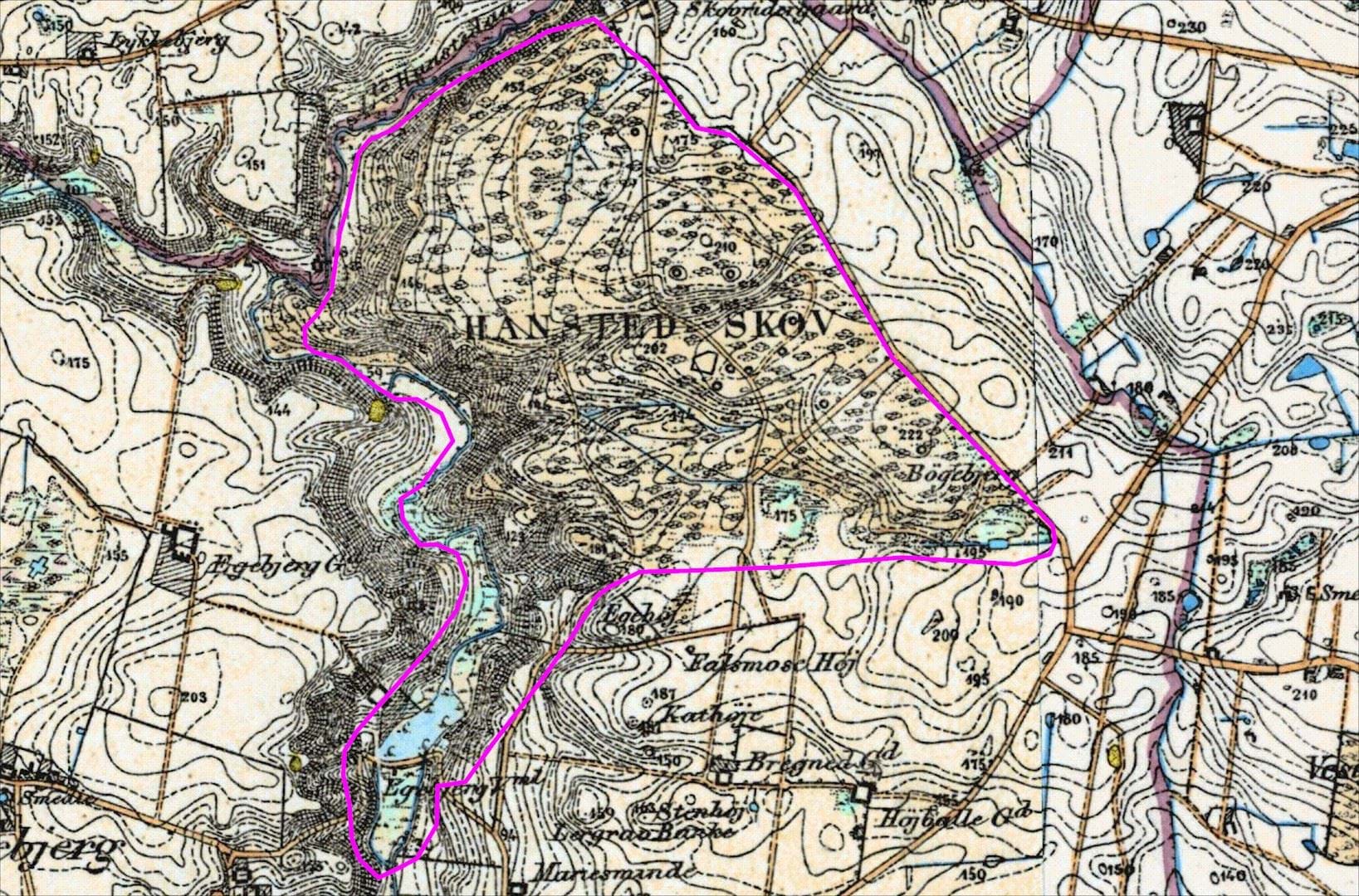 Hansted Skov afgrænses mod vest og nord af Lille Hansted Å og Tolstrup Å. Fra åerne rejser skoven sig 50 meter op langs skrænterne til højdepunktet og gravhøjen Bøgebjerg (70 m). Den ældste del af skoven på bakketoppen tilhørte Hansted hospital og kan endnu erkendes ved markante fredskovsdiger. De gamle vestlige diger er i dag indesluttede i skovens midte, mens den østlige diger endnu danner skel til det åbne land. I skrænterne findes mange hulveje, der er slidt ned i terrænet. I skovens højeste område findes 12 fredede gravhøje. En af højene kaldes Døve Dortes Høj (68 m).