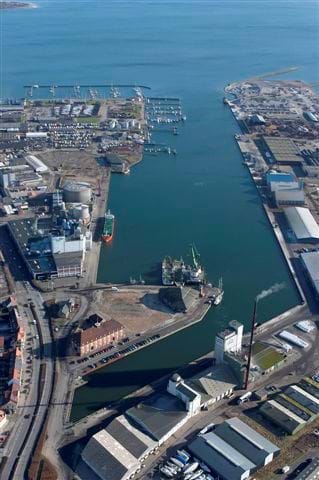 Luftfoto af Havnen, med Havnetrekanten i forgrunden