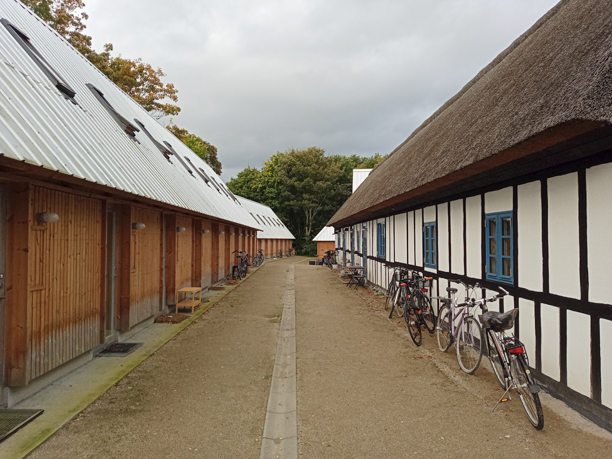 Indgangsfacaden er således orienteret mod livet i landsby-gaden til den ene side, og havefacaden mod det åbne landskab med marker, skov og natur til den anden.
