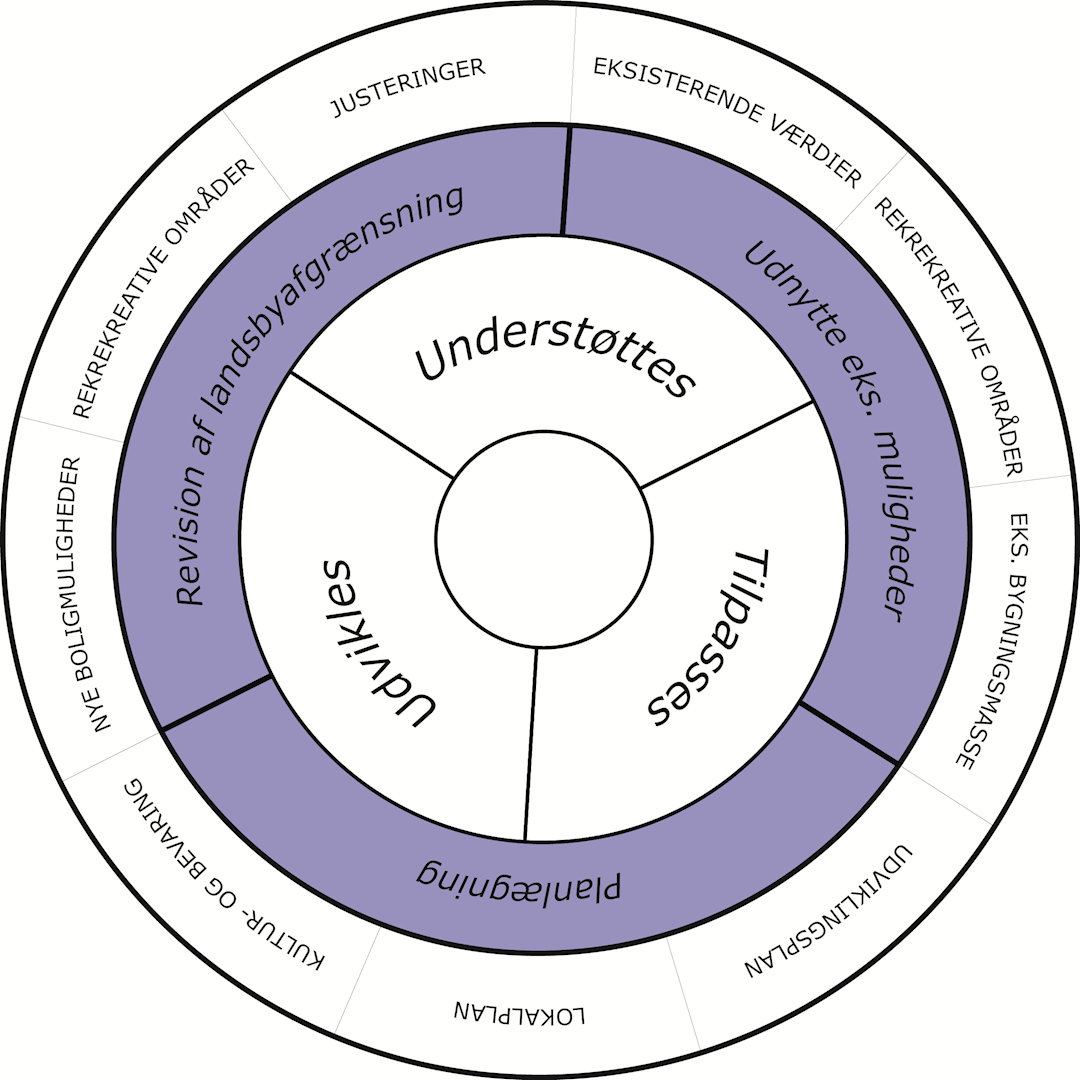Strategien for de enkelte landsbyer udmønter sig, som konkrete anvisninger, hvor byggemuligheder, rekreative områder samt ind- og udsigtskiler er kortlagt for hver landsby.