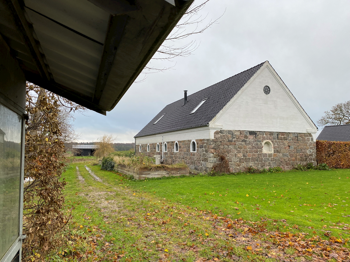 Billedet viser en ældre kampestensbygning, som en del af et gårdanlæg, i Davding.