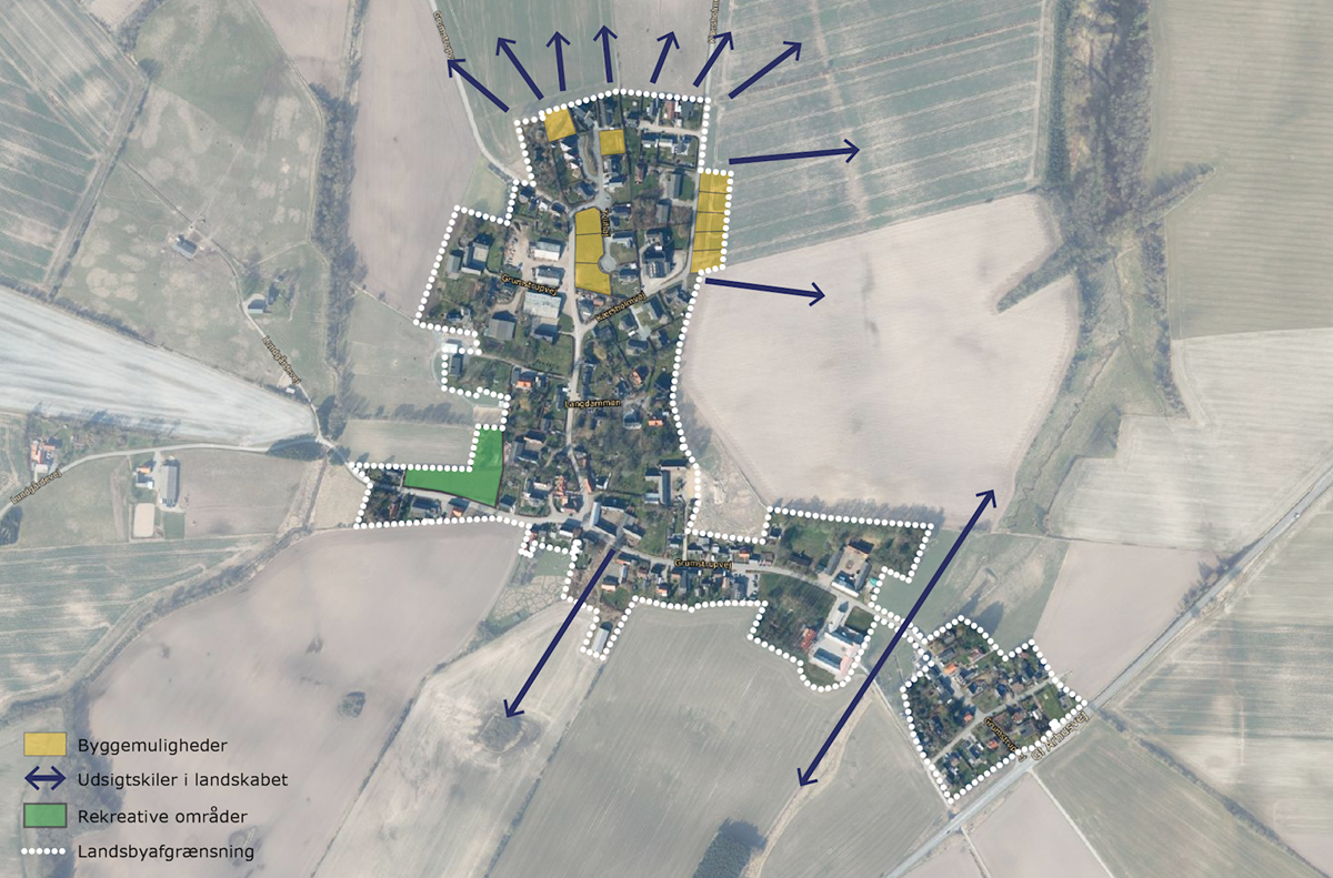 Udpegningerne er foretaget udelukkende for at give borgerne i landsbyen og evt. fremtidige bygherre, et overblik over potentielle fremtidsmuligheder. Det er altså ikke udtryk for, at kommunen kommer til at stå for evt. udvikling, byggerier eller indretning af fællesarealer. Udviklingen skal drives af private investorer, lokalråd, borgere eller fonde. Læs mere her, om hvad der kan søges støtte til i kommunen.
