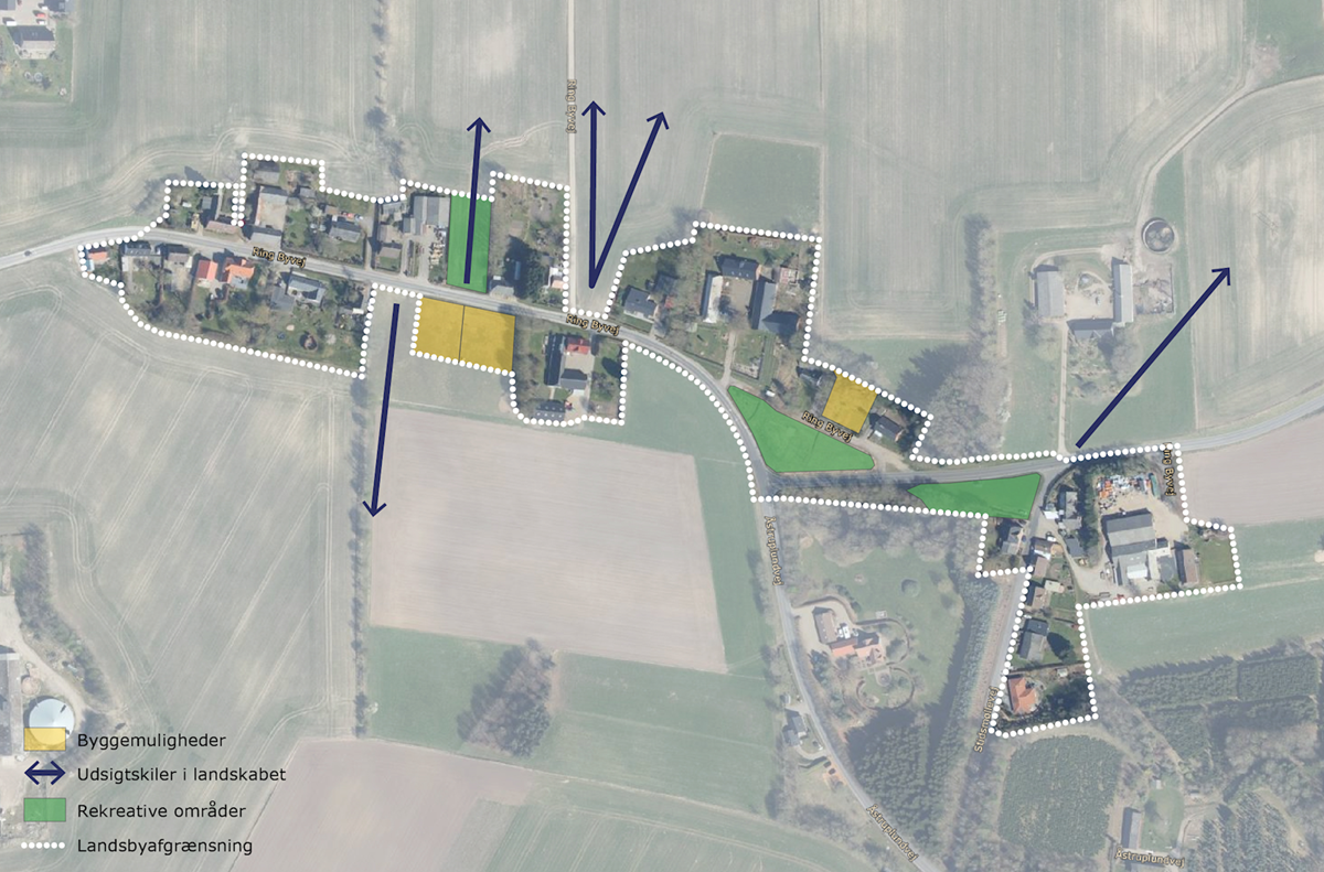 Udpegningerne er foretaget udelukkende for at give borgerne i landsbyen og evt. fremtidige bygherre, et overblik over potentielle fremtidsmuligheder. Det er altså ikke udtryk for, at kommunen kommer til at stå for evt. udvikling, byggerier eller indretning af fællesarealer. Udviklingen skal drives af private investorer, lokalråd, borgere eller fonde. Læs mere her, om hvad der kan søges støtte til i kommunen.