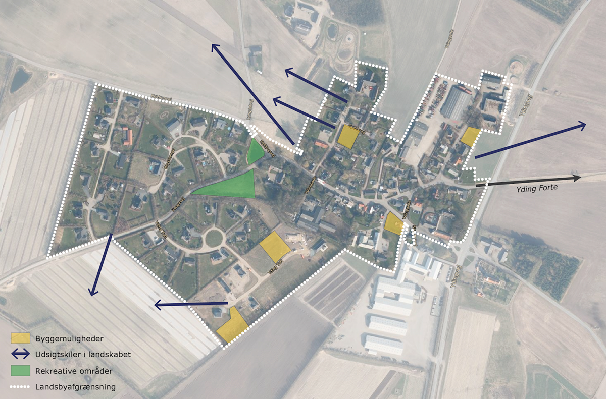 Der udpeges fem byggemuligheder i Yding, som alle ligger i forlængelse af den eksisterende struktur i landsbyen, eller er placeret som huludfyldning. - Omdannelsesmuligheder