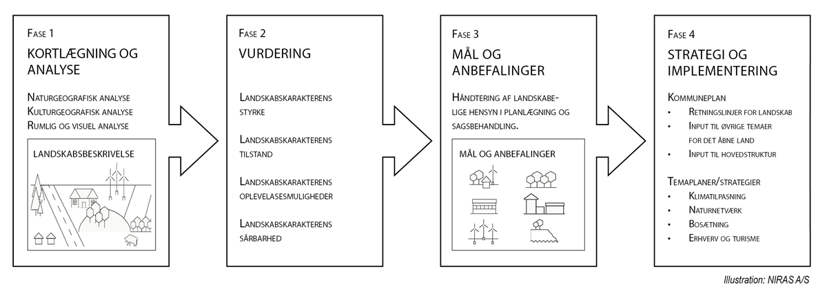 Landskabet er analyseret efter landskabskaraktermetodens principper. Metoden er tilpasset kommunens behov og fokus på, at analysen og landskabsplanen er et arbejdsredskab. Metodens begreber er beskrevet på siderne under begreber, mens tilgangen til metoden er beskrevet på siderne i dette kapitel.