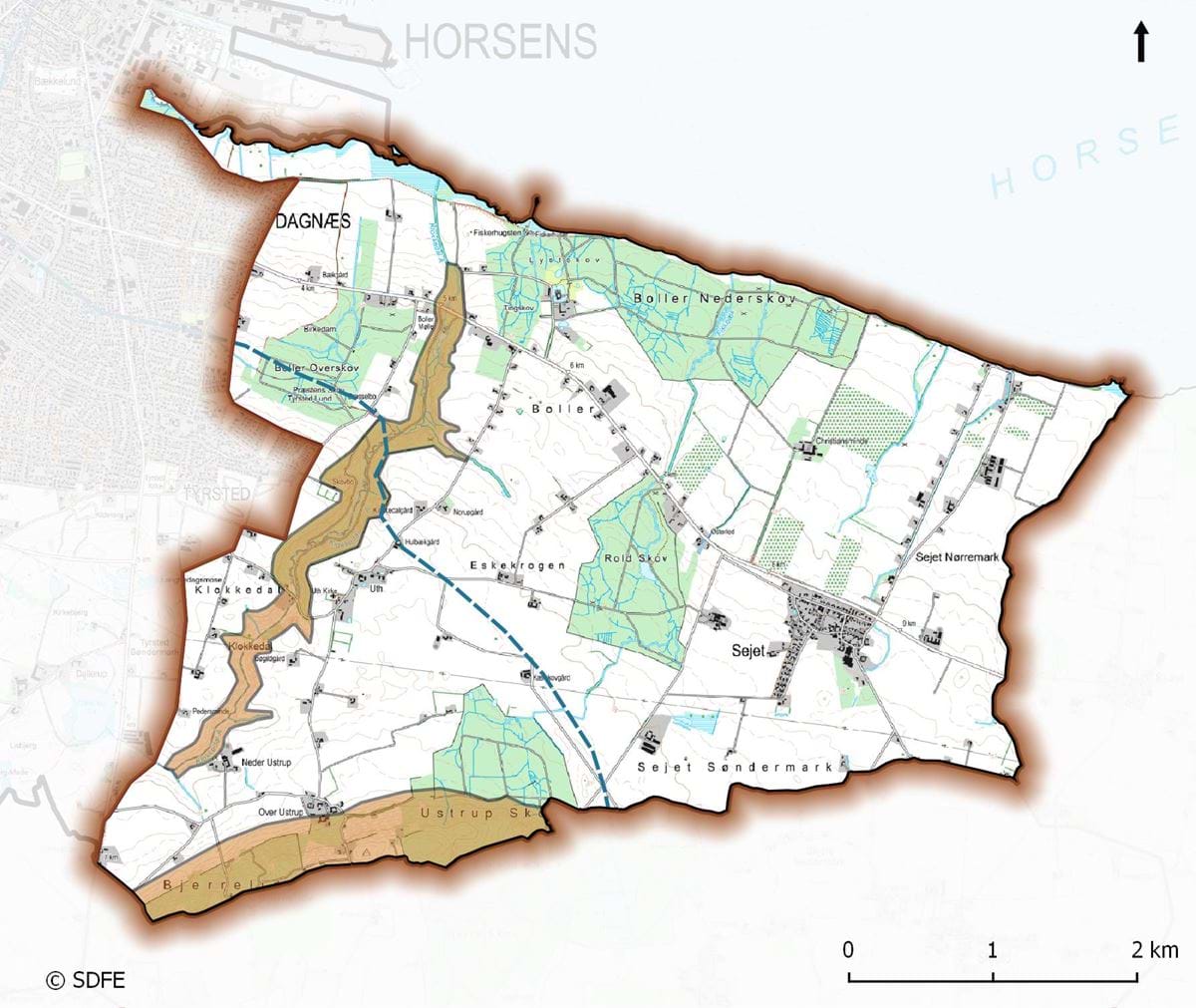 Landskabet har en meget enkelt karakter, der er præget af store marker, der afgrænses af lange, markante skovbryn. Ved Dagnæs er kysten præget af strandenge. Små husmandsbrug ligger som perler på en snor ved Boller Hovedgård, Christiansminde og Sejet Nørremark, mens spredt beliggende gårde og landsbyer præger den sydlige del.