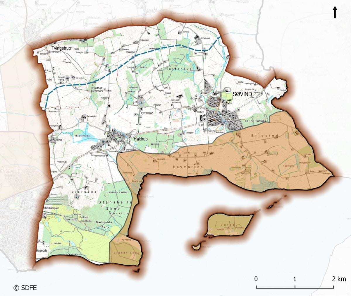Det bakkede terræn er præget af marker, der indrammes af hegn eller små skove, der flere steder præger og indrammer landskabet. Langs vejene ligger små husmandsbebyggelser og gårde, og langs med Haldrupvej ligger de to små byer Haldrup og Søvind.