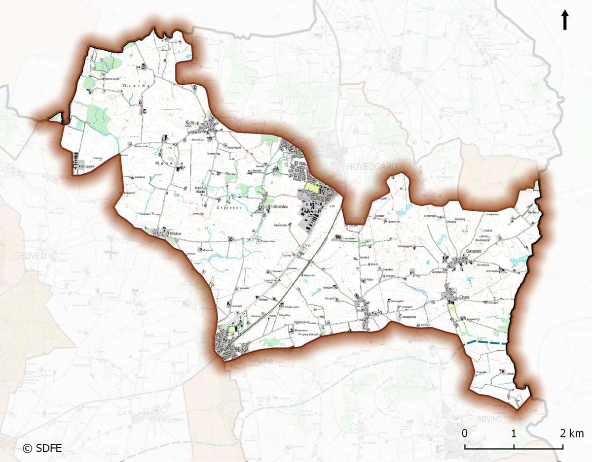 På tværs af den centrale del af området forløber jernbanen, som ved den nordlige og sydlige områdegrænse omsluttes af stationsbyerne Hovedgård og Tvingstrup.