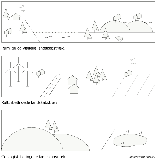 Områdets bærende landskabstræk er bestemt af geologisk betingede og kulturbetingede landskabstræk samt rumlige og visuelle landskabstræk.