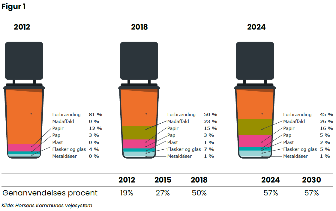 Med denne plans initiativer forventes, at en endnu større andel af dagrenovationen flyttes fra forbrænding til genanvendelse. I prognosen for mængderne i 2024 er der taget højde for den forventede befolkningstilvækst i Horsens Kommune.