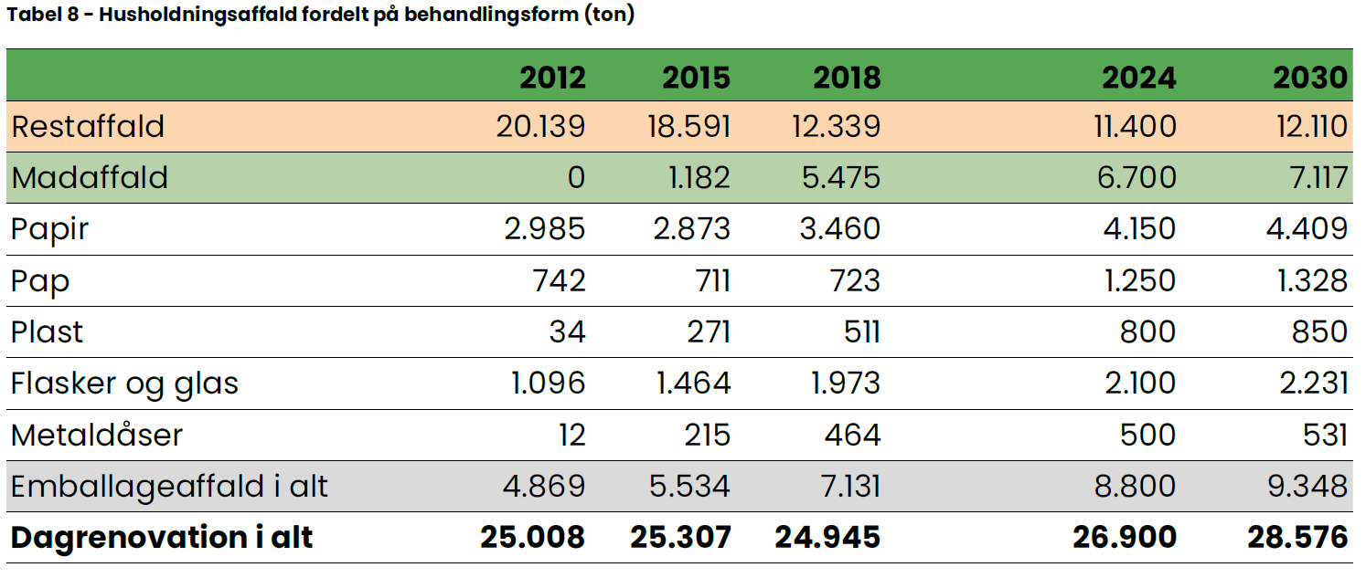 Tabel 8 viser resultatet af en øget affaldssortering ved husholdningerne. Mængden af restaffald er i perioden 2012-2018 faldet med 34% fra 18.552 ton til 12.158 ton. Samtidig er mængden af indsamlet madaffald steget fra 0 ton til 5.475 ton. Mængden af indsamlet papir og emballage er også steget i perioden.