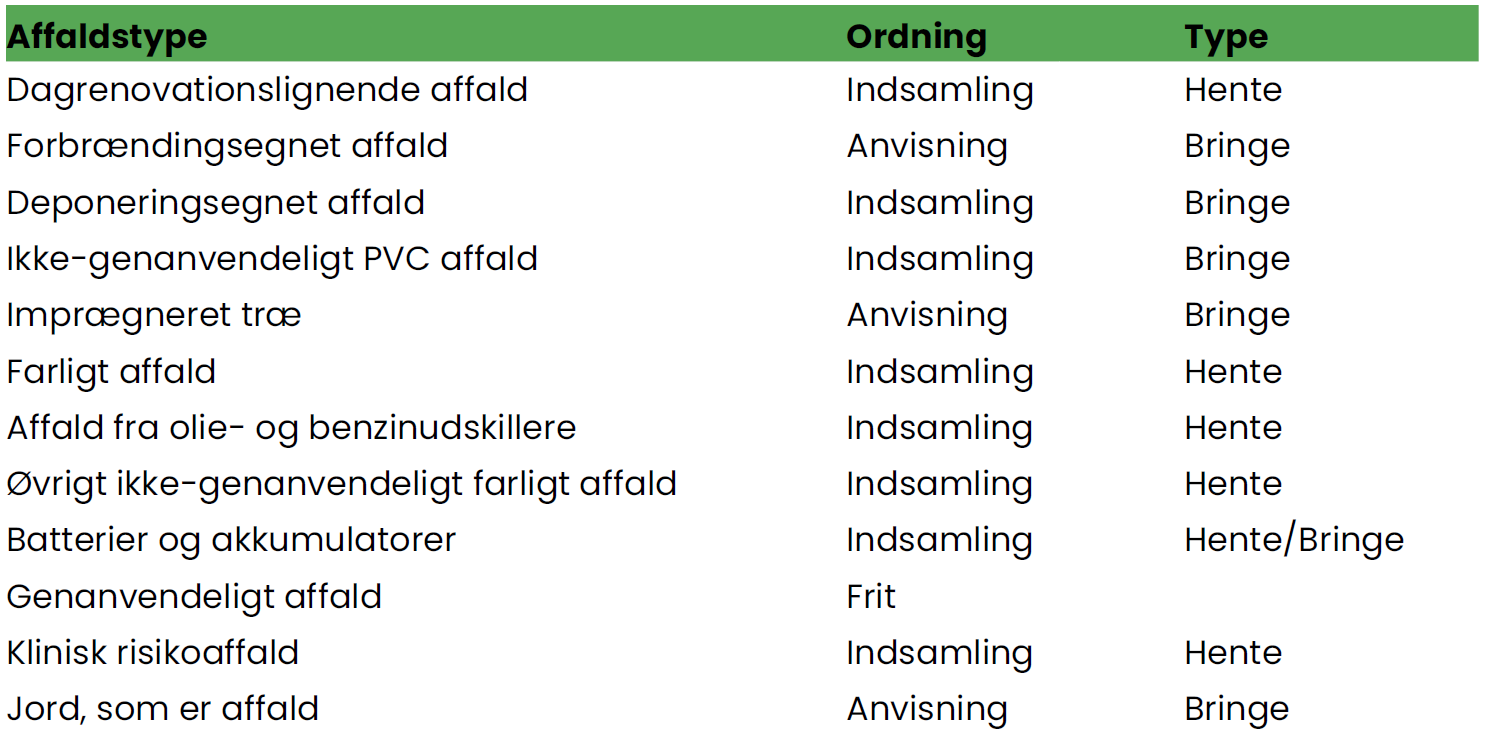 Mindre mængder deponeringsegnet affald kan afleveres til Horsens Kommunes genbrugspladser.