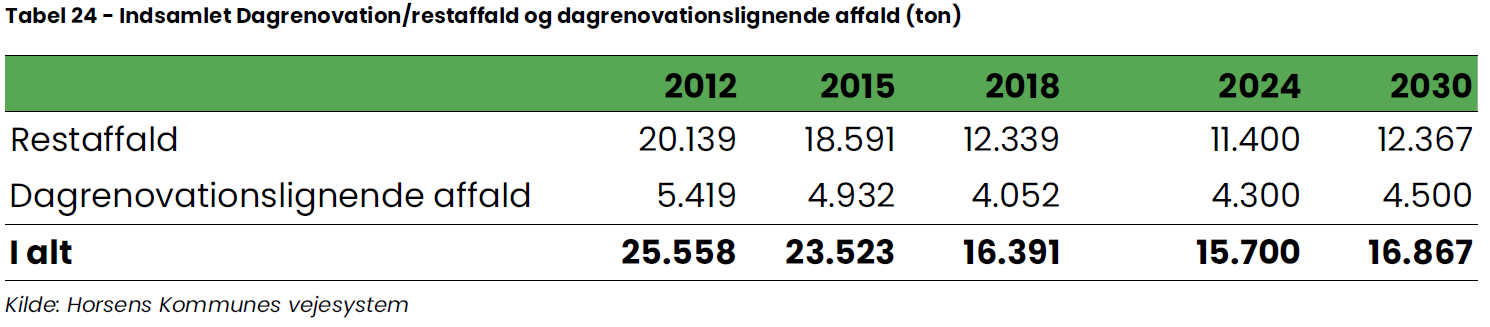 Opgørelsen af de indsamlede restaffaldsmængder i forhold til dagrenovationslignende affald er foretaget på baggrund af en samlet indvejet mængde dagrenovation, som efterfølgende er fordelt på husholdninger og erhverv ud fra oplysninger om antal og størrelse af materiel tilknyttet henholdsvis husholdninger og erhverv Horsens Kommune anslår, at dagrenovationslignende affald i 2012 udgjorde ca. 21% af den indsamlede mængde, mens den i 2018 udgjorde ca. 25%.