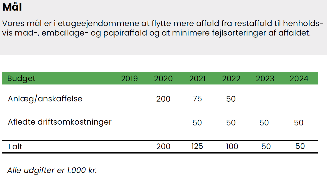 Vi vil lave indsatser for at hjælpe beboerne til at sortere deres restaffald bedre og for at få dem til at bruge de udleverede madaffaldsposer. Endvidere vil vi formidle, at emballage- og papiraffald ikke må lægges i affaldsposer. Vi vil afholde årlige møder med servicemedarbejderne, da de er de bedste ambassadører for affaldssorteringen.