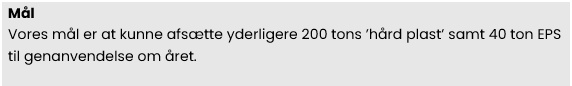 Vi har i mange år indsamlet plasttypen EPS (Flamingo), men transporten til modtageranlæg er både vanskelig og dyr, da det fylder en del. Derfor vil vi komprimere EPS’en i en specialcontainer på genbrugspladsen inden transporten. Specialcontaineren placeres direkte på genbrugspladsen, så transporteren af affaldet optimeres.