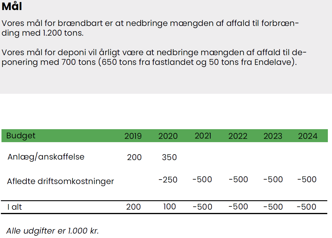 På Endelave forventer vi at etablere en ny ordning med bedre muligheder for at sortere i flere typer af affald. Det vil forventeligt give en årlig reduktion af affald til deponi med 50 tons årligt.