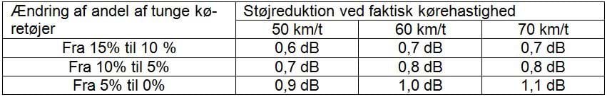 Tabel 7.1.5 – Støjreduktion ved ændring af andel af tunge køretøjer