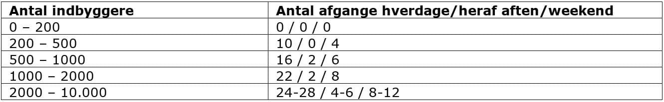 - Der skal være tale om afgange til kommunecenter/anden større relevant by.