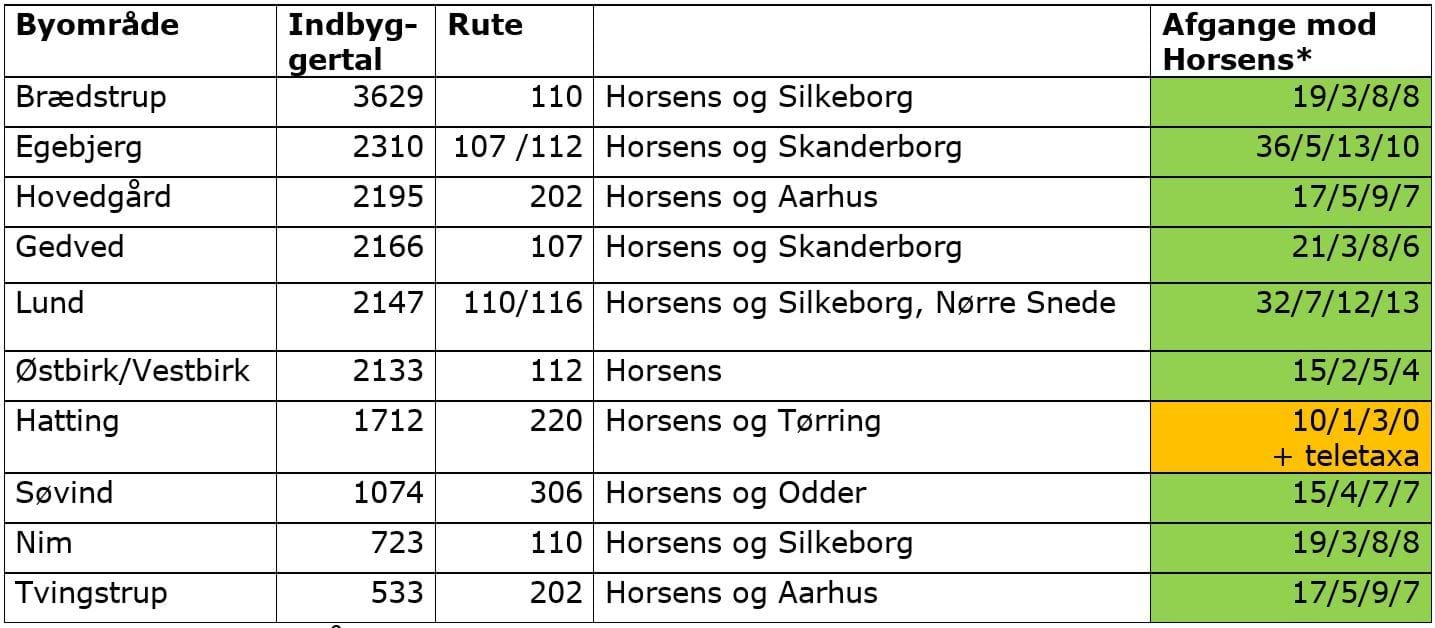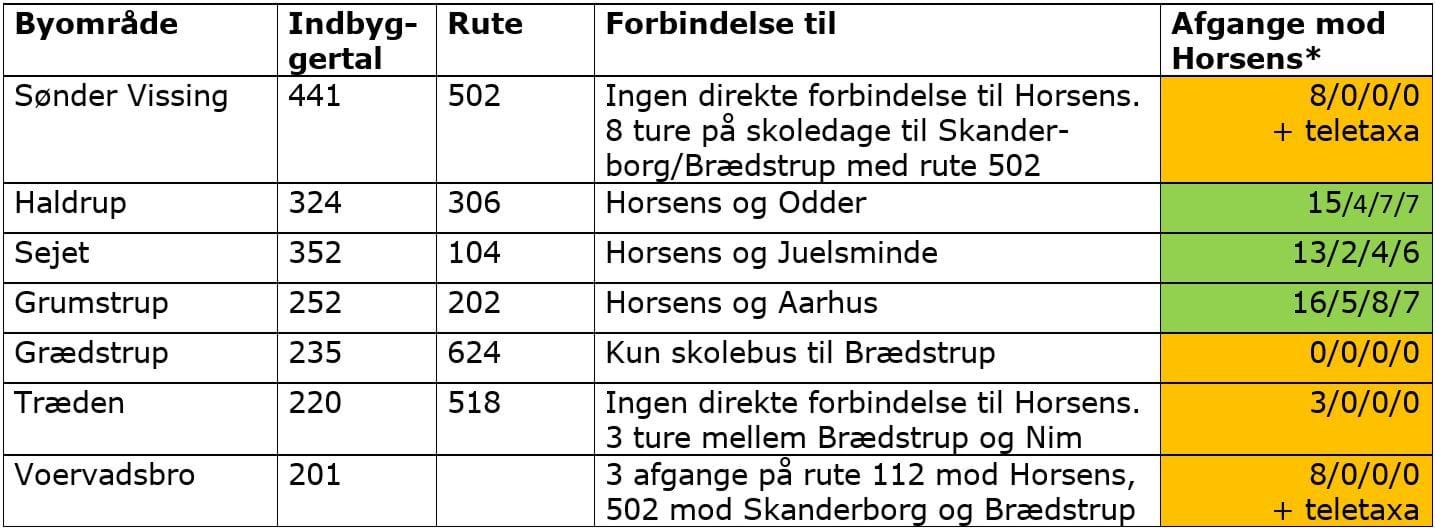Der er som nævnt 10 byområder uden for Horsens by med flere end 500 indbyggere. De fremgår af nedenstående tabel, som viser, hvordan byområderne er betjent med busdrift til Horsens og andre større byområder. Det er markeret med grønt om betjeningen lever op til servicemålene. Det skal i den forbindelse bemærkes, at der her kun er angivet forbindelser i den ene retning. Servicemålene angiver ture i begge retninger. Tallene i tabellerne skal derfor dobles op, før der sammenlignes med servicemålene.