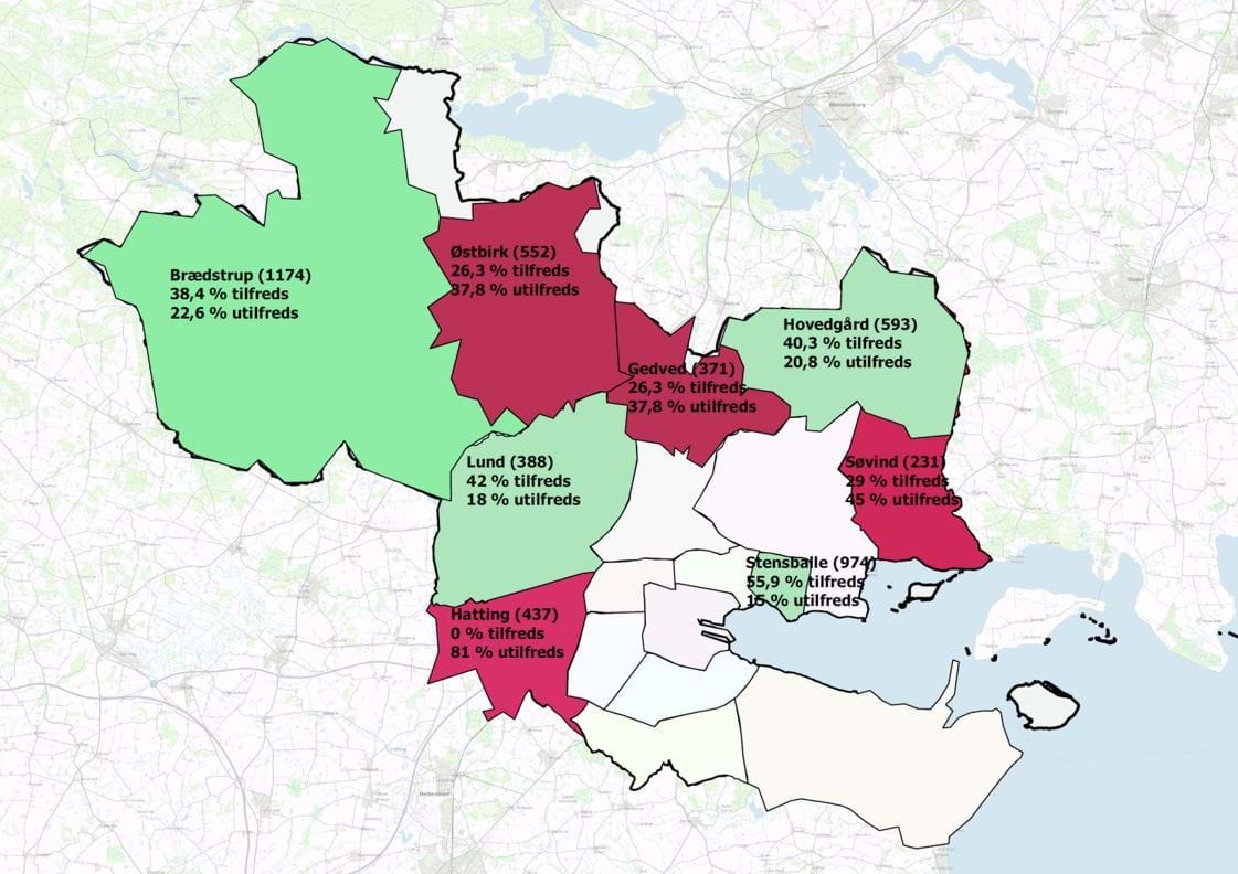 I E-boksundersøgelsen er der dog væsentlige forskelle i tilfredsheden med betjeningen mellem de forskellige områder. Østbirkområdet, Gedved, Hatting og Søvind skiller sig ud med den mest negative vurdering.