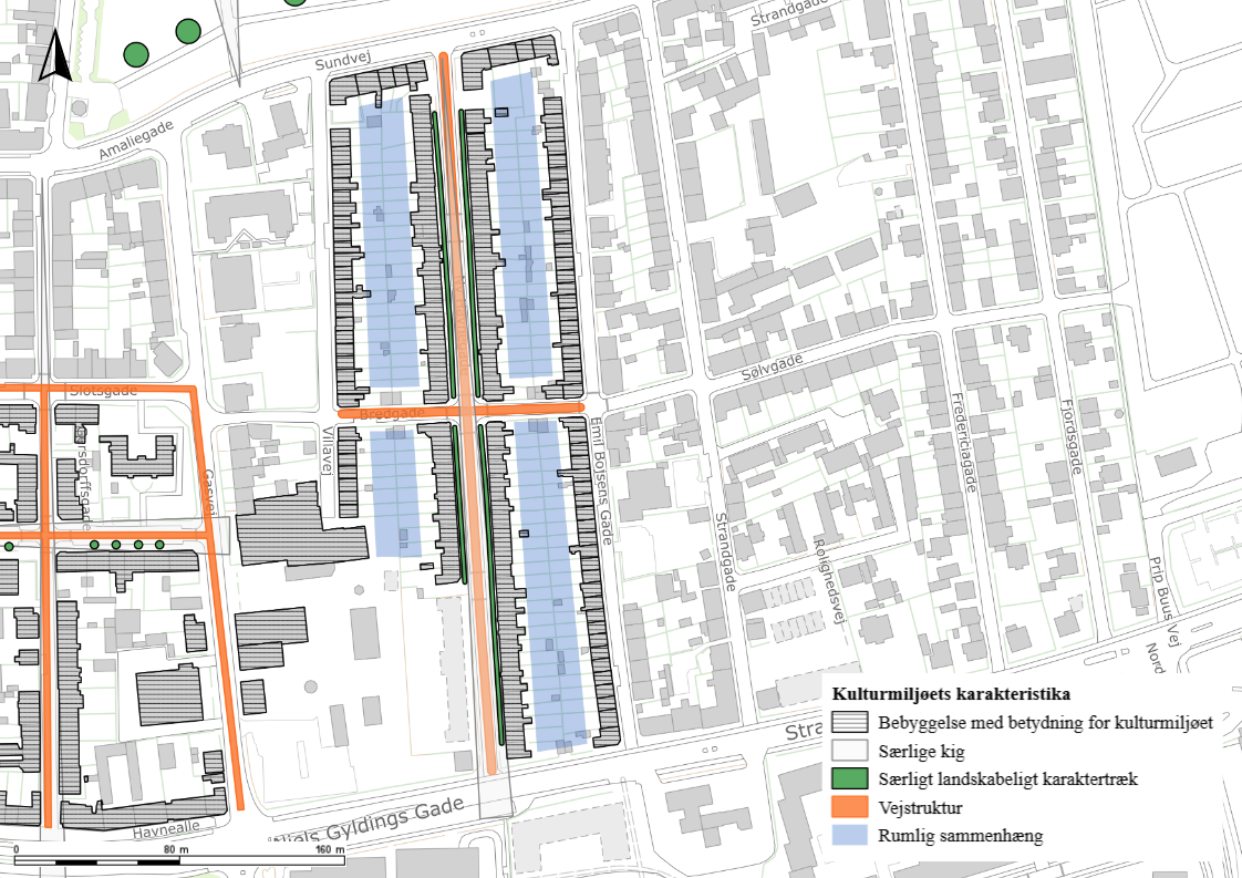 Ny Havnegade skæres af Bredgade. Skæringen markeres ved, at hjørnebebyggelsen har skråt afskårne hjørner og karnapper. Bredgades vandrette forløb og de lave havemure og mindre skurbebyggelser giver en tydelig forståelse af kvarterets bebyggelsesmønster, som bygger på lav randbebyggelse af enkelthuse med en lille forhave mod gaden og grønne velbelyste gård- og bagarealer.