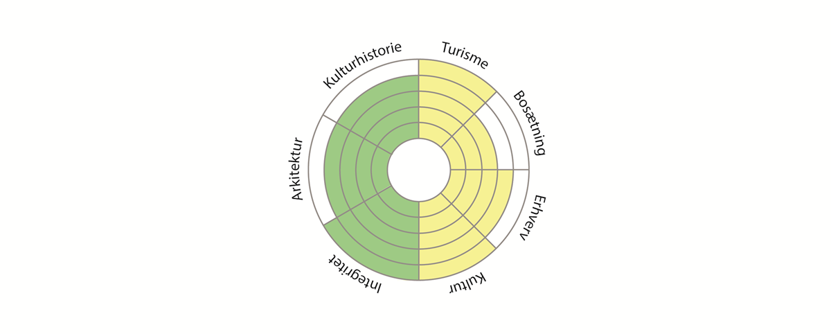 Kulturmiljøet fremstår med høj grad af integritet, og byrum og bygninger virker sammenhængende. Stedet har potentiale som løftestang for både kultur og erhvervsaktiviteter.