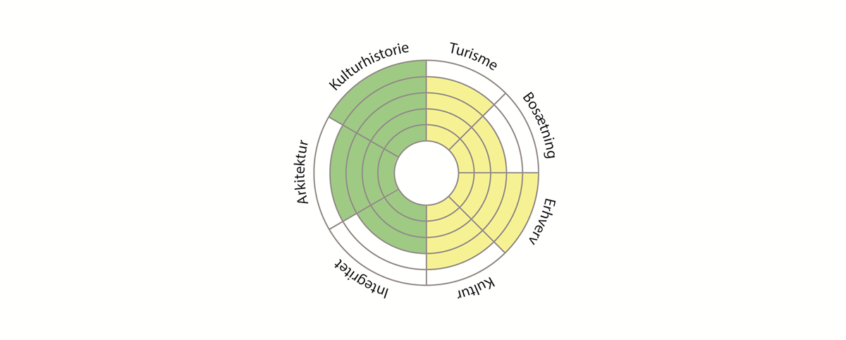 Kulturmiljøet er velbevaret og en interessant oplevelse med en bred variation i arkitektur, detaljer og referencer, som kan understøtte både turisme, men også en spændende urban kontekst for en virksomhed.