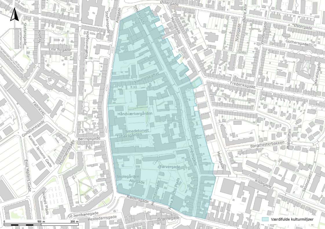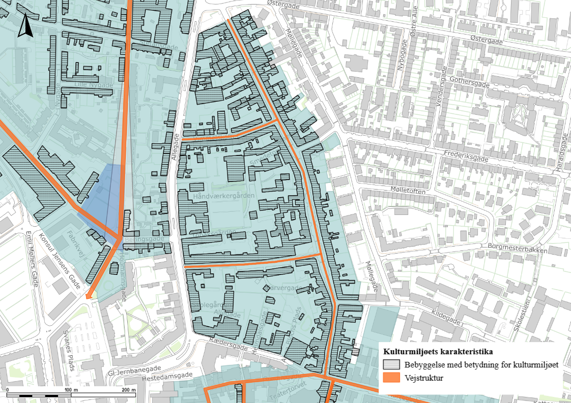 Vejstrukturen og kulturmiljøets variation af karakter i gaderum med både karré bebyggelser helt ud til gaden, dobbeltvillaer med små forhaver og alléer bør fastholdes.