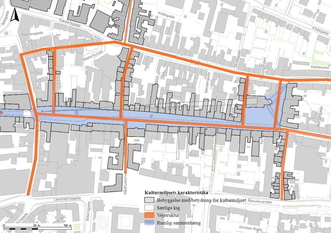 Bebyggelsen med betydning for kulturmiljøet er definerende for 1700-tallets fortælling om bebyggelse på middelalderens bystruktur. Bygningerne er sårbare overfor ændringer i arkitektur, rytme og skala herunder også i portåbninger.