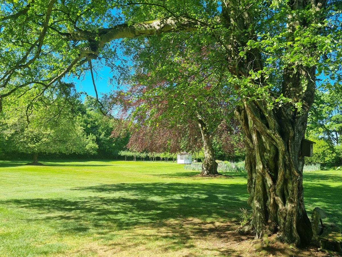 Haveanlægget ligger endnu vest for hovedbygningen og gården har et romantisk parkanlæg med broer og vandløb, som grænser op til skoven. Skoven er omkranset at store fredskovsdiger.