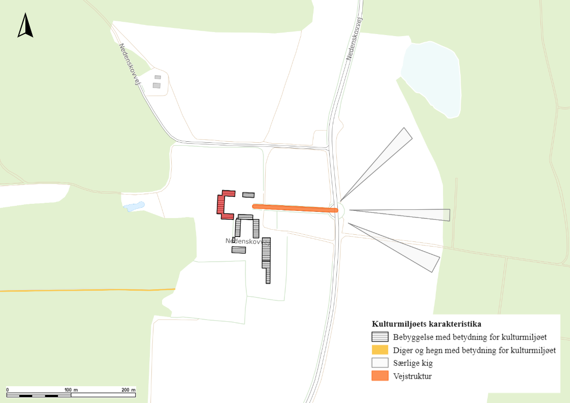 En firlænget avlsgård stammer fra Nedenskovgård, tre af længerne er i bindingsværk med stråtag og ses endnu.