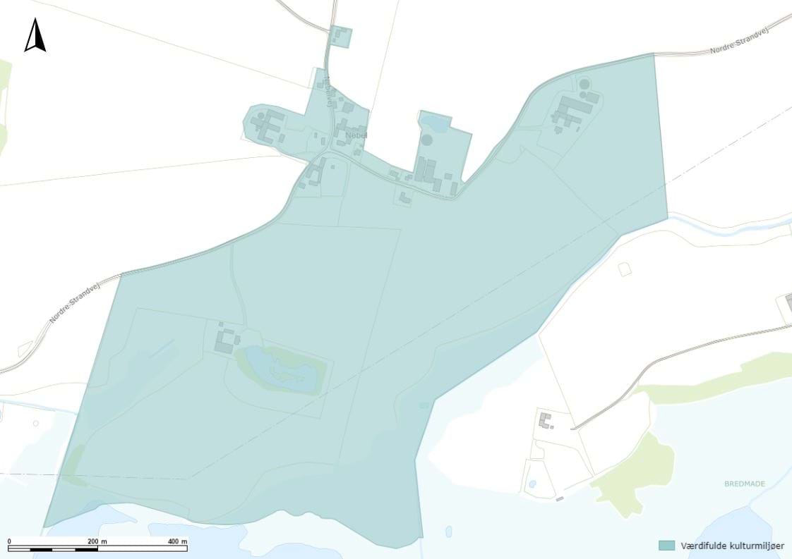 Landsbyen har fælles ejede matrikler mod fjorden til tørvegravning, og veje, hegn og diger fra udskiftningstiden er stadig synlige. Landskabet omkring Nebel er kuperet og varieret, med udsigt til Nørrestrand og Horsens Fjord mod syd. Store solitære træer og spredt beplantning understreger landsbyens struktur og beskytter mod det åbne land, samtidig med at de begrænser indkigget til byen.