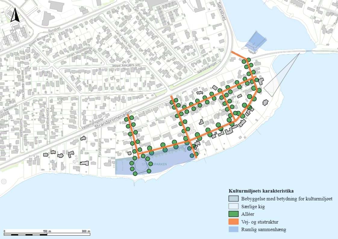 Karakteristisk for miljøet er den strukturelle opbygning med markant allé struktur og park med udsigtspunkt mod fjorden. Strandparken er også i dag et populært mødested og udflugtsmål.