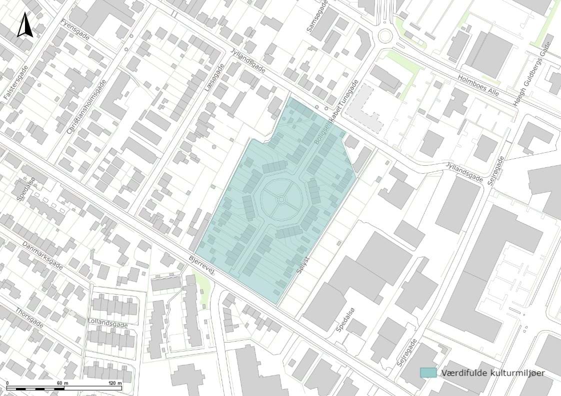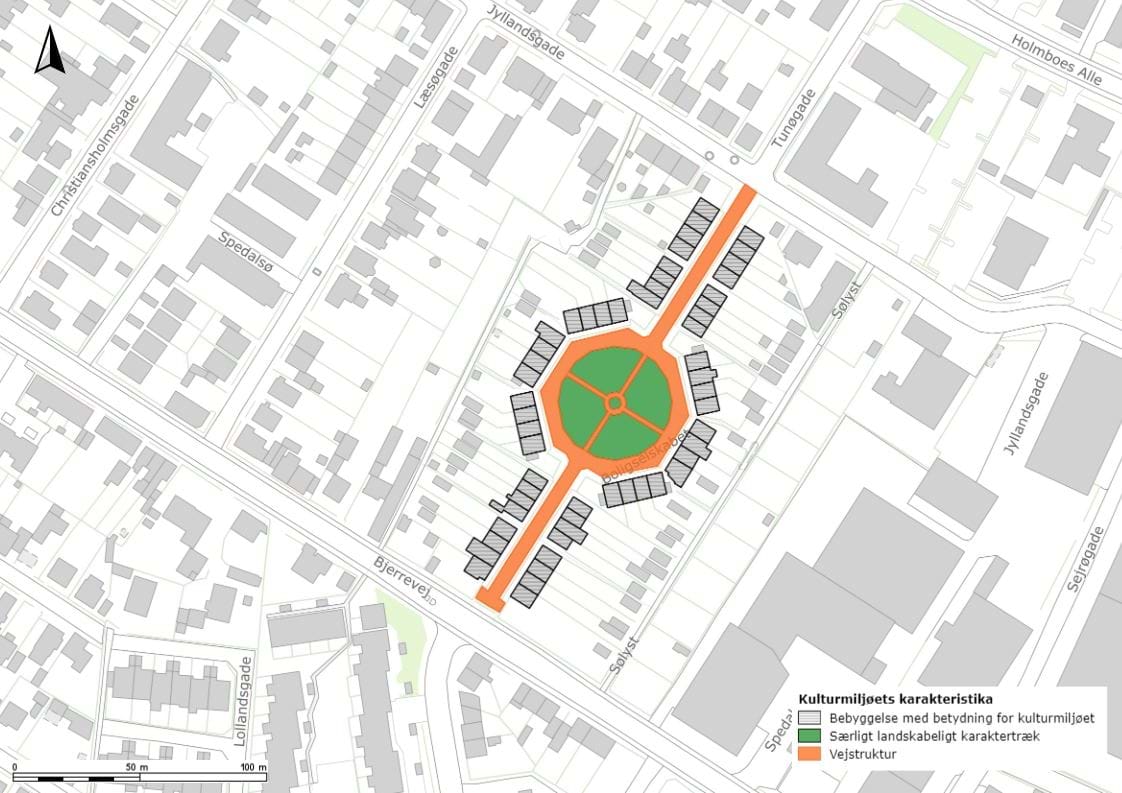 Kulturmiljøets bærende elementer er bygningernes struktur og sammenhæng.