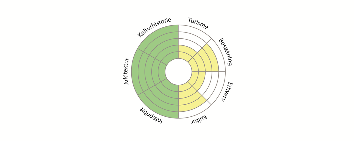 Diagrammets gule potentialevurdering, afspejler at miljøet består af boliger, og ikke understøtter en udvikling af turisme og erhverv. Samtidig understøtter kulturmiljøet en bærende fortællingen om byggeforeninger i Horsens.