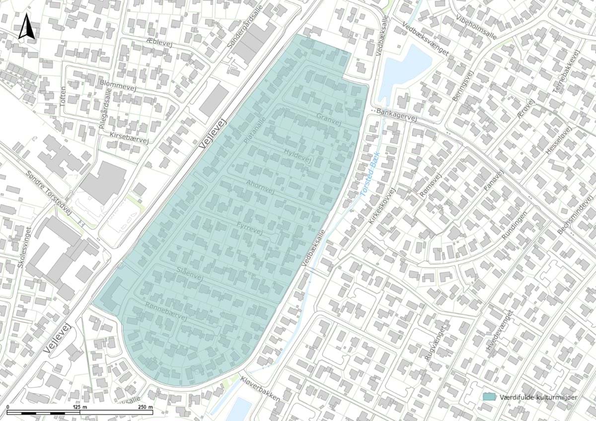 Vedbæksallé, der er anlagt som en typisk parcelhusbebyggelse med typehuse 1961-70 i udkanten af det gamle Torsted, udpeges som særlig bevaringsværdigt kulturmiljø.