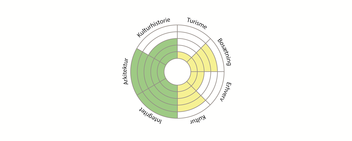 Diagrammet afspejler at miljøet har en høj arkitektonisk værdi, som et repræsentativt miljø for parcelhuskvarteret som type. Funktioner og sammenhænge i området er intakte og aflæselige.